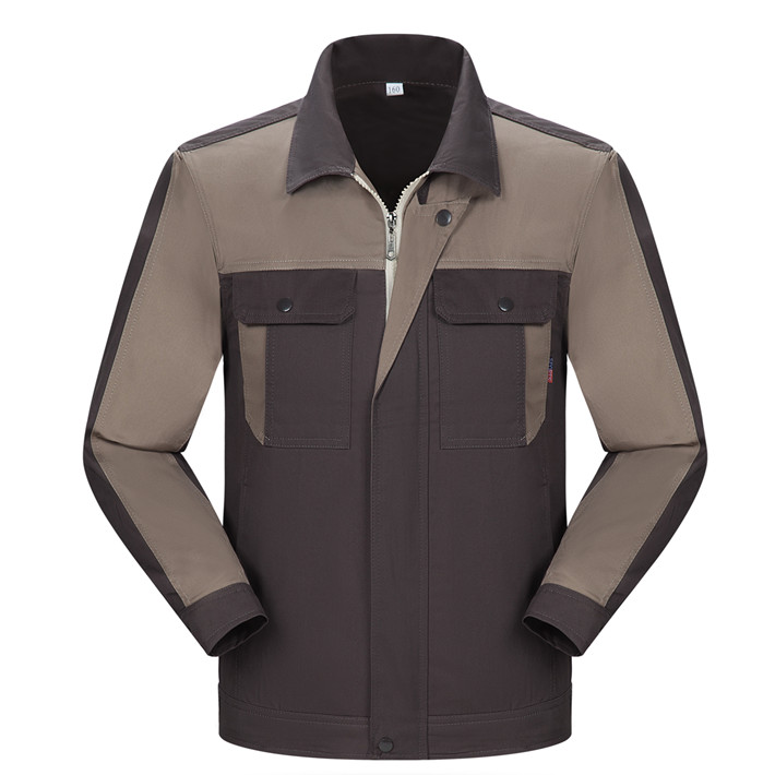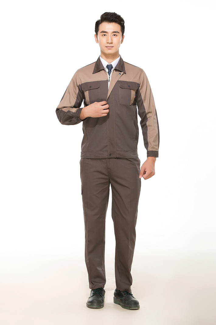 全棉紗卡卡其色拼灰色拉鏈?zhǔn)焦ぷ鞣L袖套裝GZ-8023